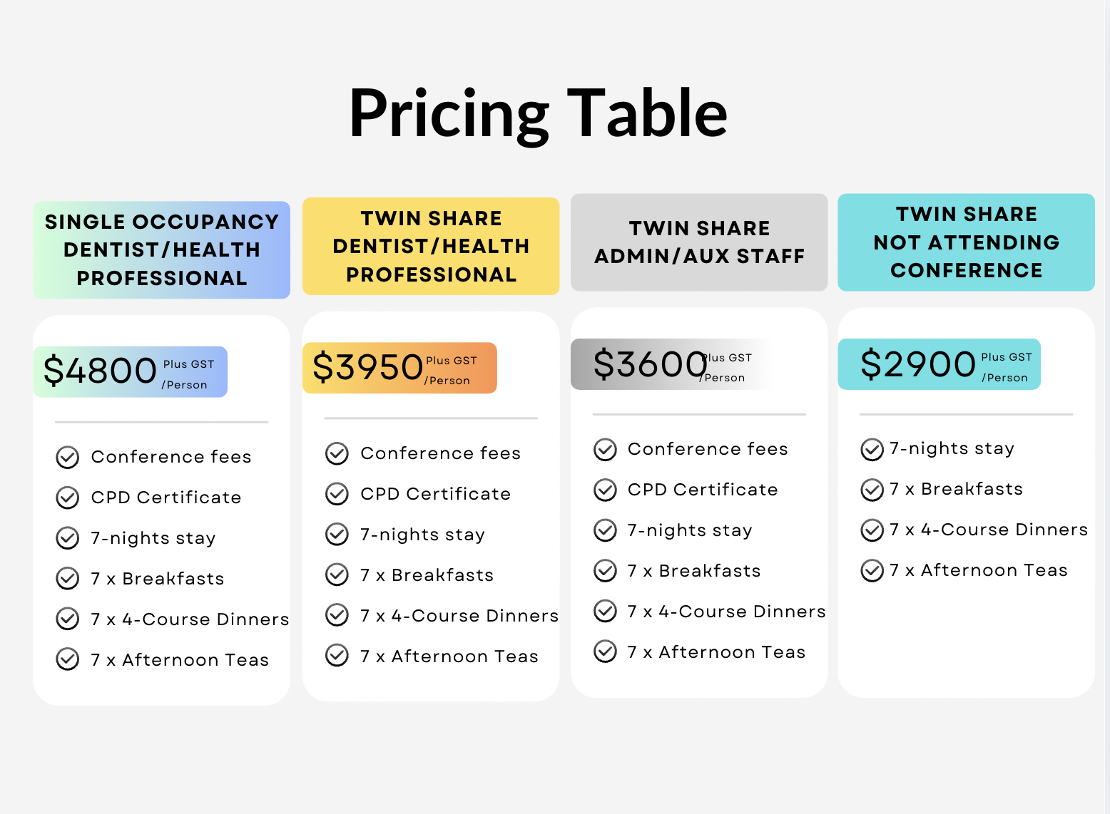 Pricing will change from Tuesday 1st Sept 2026 to Single Occupancy $4900, Twin Share $4050, Twin Share Auxillaries $3700, Twin Share (non conference) $2950. All prices are plus GST per person.