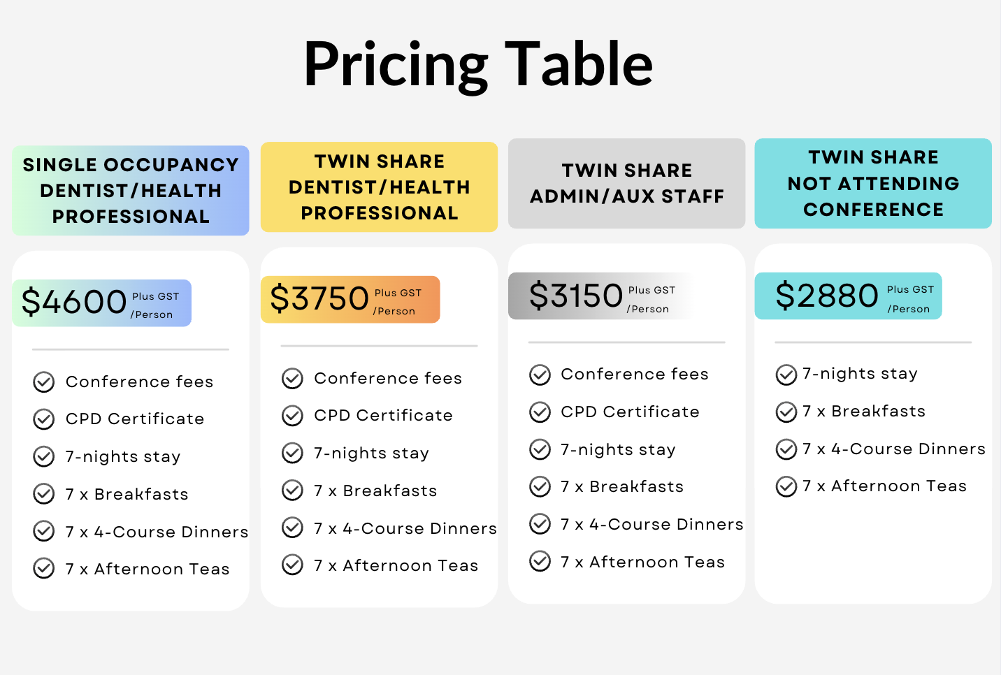 As a condition of registration, accommodation and the CE course is a package for each delegate is included for the duration of the course. We can’t offer seperate course fees and accommodation locations. The dental education and accommodation course must be booked through Highlands Professional Development. Should you wish to book accommodation for your family direct with the hotel you can contact Hotel Diamant directly. Please find conference rates in the table.